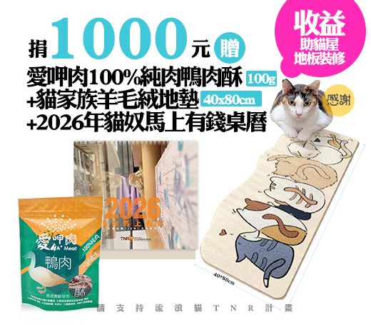 贈品名稱: 捐1000元贈愛呷肉100%純肉鴨肉酥(100g)+貓家族羊毛絨地墊(40x80cm)+2026年貓奴馬上有錢桌曆 贈品總數: 25人 每人捐款金額: 1000元 已報名名額: 3 尚需求名額: 22 報名人員: 1.angel (已付款)