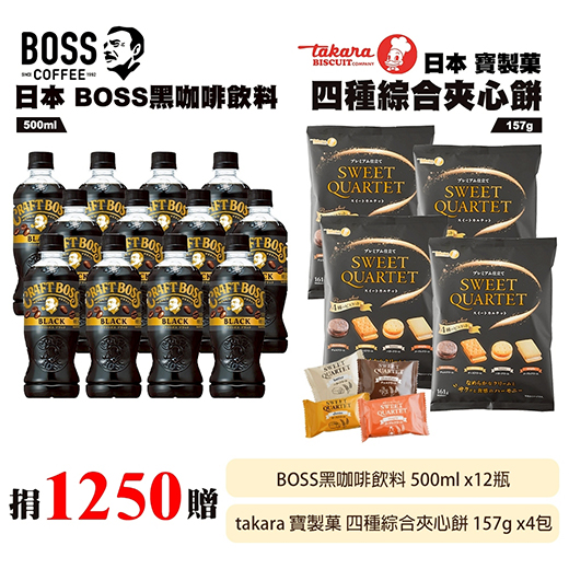 候補人員: 說明: 捐1250元贈日本Suntory BOSS黑咖啡12瓶+Takara寶製菓 四種奶油綜合夾心餅4包組