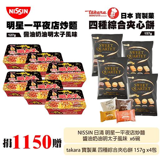 候補人員: 說明: 捐1150元贈日清NISSIN明星一平夜店炒麵醬油奶油明太子風味6碗+Takara寶製菓 四種奶油綜合夾心餅4包組