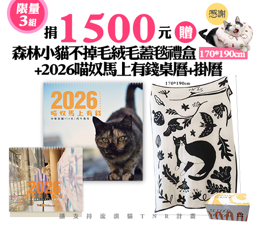 候補人員: 說明: 捐1500元贈森林小貓不掉毛絨毛蓋毯禮盒(170*190cm) +2026喵奴馬上有錢桌曆+掛曆