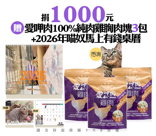 贈品名稱: 捐1000元贈愛呷肉100%純肉雞胸肉塊3包+2026年喵奴馬上有錢桌曆 贈品總數: 50人 每人捐款金額: 1000元 已報名名額: 0 尚需求名額: 50 報名人員: 候補人員: 說明: 捐1000元贈愛呷肉100%純肉雞胸肉塊3包+2026年喵奴馬上有錢桌曆