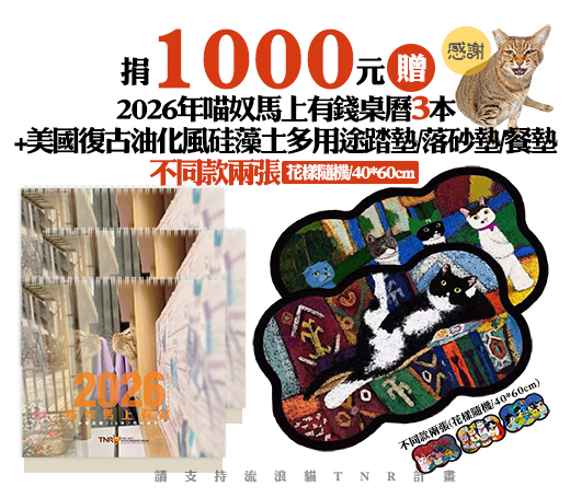 贈品名稱: 捐1000元贈2026年喵奴馬上有錢桌曆3本+美國復古油化風硅藻土多用途踏墊/落砂墊/餐墊不同款兩張(花樣隨機/40*60cm) 贈品總數: 30人 每人捐款金額: 1000元 已報名名額: 0 尚需求名額: 30 報名人員: 候補人員: 說明: 捐1000元贈2026年喵奴馬上有錢桌曆3本+美國復古油化風硅藻土多用途踏墊/落砂墊/餐墊不同款兩張(花樣隨機/40*60cm)