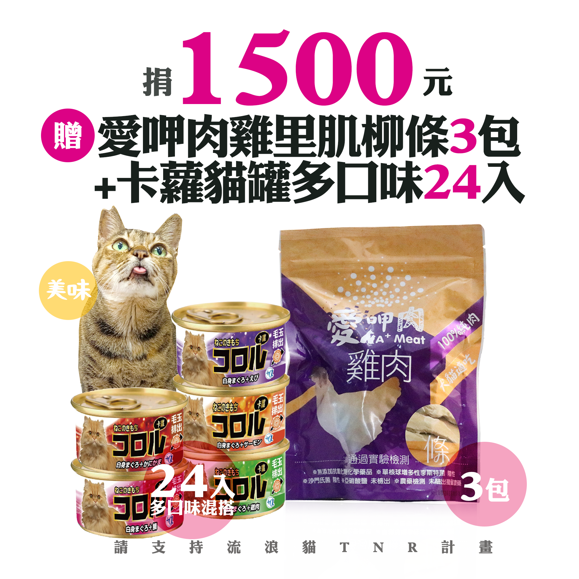 候補人員: 說明: 捐1500元贈愛呷肉雞里肌柳條3包+卡蘿貓罐多口味24入
