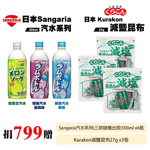 候補人員: 說明: 捐799元贈日本Sangaria哈密瓜/葡萄/彈珠汽水6瓶+Kurakon減鹽昆布3包組