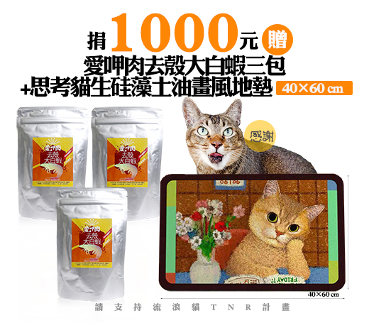 贈品名稱: 捐1000贈愛呷肉去殼大白蝦三包+思考貓生硅藻土油畫風地墊(40×60 cm) 贈品總數: 20人 每人捐款金額: 1000元 已報名名額: 0 尚需求名額: 20 報名人員: 候補人員: 說明: 捐1000贈愛呷肉去殼大白蝦三包+思考貓生硅藻土油畫風地墊(40×60 cm)