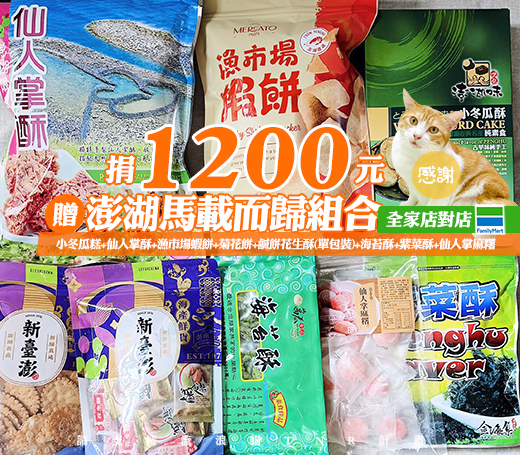 贈品名稱: 捐1200元贈澎湖馬載而歸組合(全家店到店)(小冬瓜糕+仙人掌酥+漁市場蝦餅+菊花餅+鹹餅花生酥(單包裝)+海苔酥+紫菜酥+仙人掌麻糬) 贈品總數: 30人 每人捐款金額: 1200元 已報名名額: 0 尚需求名額: 30 報名人員: 候補人員: 說明: 捐1200元贈澎湖馬載而歸組合(全家店到店)(小冬瓜糕+仙人掌酥+漁市場蝦餅+菊花餅+鹹餅花生酥(單包裝)+海苔酥+紫菜酥+仙人掌麻糬)