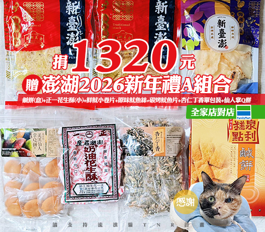 贈品名稱: 捐1320元贈澎湖2026新年禮A組合(全家店到店)(鹹餅(盒)+正一花生酥(小)+鮮魷小卷片+原味魷魚絲+碳烤魷魚片+杏仁丁香單包裝+仙人掌Q餅) 贈品總數: 30人 每人捐款金額: 1320元 已報名名額: 0 尚需求名額: 30 報名人員: 候補人員: 說明: 捐1320元贈澎湖2026新年禮A組合(全家店到店)(鹹餅(盒)+正一花生酥(小)+鮮魷小卷片+原味魷魚絲+碳烤魷魚片+杏仁丁香單包裝+仙人掌Q餅)