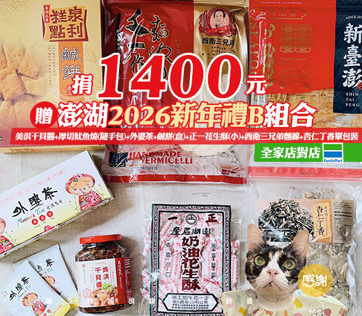 贈品名稱: 捐1400元贈澎湖2026新年禮B組合(全家店到店)(美淇干貝醬+厚切魷魚燒(隨手包)+外婆茶+鹹餅(盒)+正一花生酥(小)+西衛三兄弟麵線+杏仁丁香單包裝) 贈品總數: 30人 每人捐款金額: 1400元 已報名名額: 0 尚需求名額: 30 報名人員: 候補人員: 說明: 捐1400元贈澎湖2026新年禮B組合(全家店到店)(美淇干貝醬+厚切魷魚燒(隨手包)+外婆茶+鹹餅(盒)+正一花生酥(小)+西衛三兄弟麵線+杏仁丁香單包裝)
