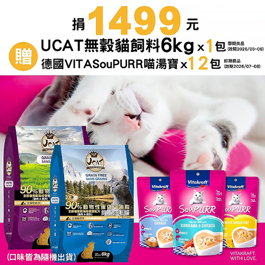 贈品名稱: 捐1499元贈UCAT 天然無穀貓飼料6kg*1 +德國Vita喵湯寶*12包 (口味皆隨機出貨) 贈品總數: 30人 每人捐款金額: 1499元 已報名名額: 0 尚需求名額: 30 報名人員: 候補人員: 說明: 捐1499元贈UCAT 天然無穀貓飼料6kg*1 +德國Vita喵湯寶*12包 (口味皆隨機出貨)