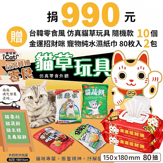 贈品名稱: 捐990元贈台韓模擬貓草包玩具*10(圖案隨機)+金運招財咪濕紙巾*2包 贈品總數: 30人 每人捐款金額: 990元 已報名名額: 0 尚需求名額: 30 報名人員: 候補人員: 說明: 捐990元贈台韓模擬貓草包玩具*10(圖案隨機)+金運招財咪濕紙巾*2包
