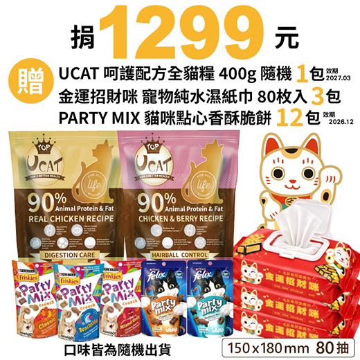 贈品名稱: 捐1299元贈PARTY MIX 貓咪點心香酥脆餅*12包 +UCAT 呵護配方全貓糧 400g*1包 +金運招財咪 寵物純水濕紙巾 80枚入*3包 贈品總數: 30人 每人捐款金額: 1299元 已報名名額: 0 尚需求名額: 30 報名人員: 候補人員: 說明: 捐1299元贈PARTY MIX 貓咪點心香酥脆餅*12包 +UCAT 呵護配方全貓糧 400g*1包 +金運招財咪 寵物純水濕紙巾 80枚入*3包