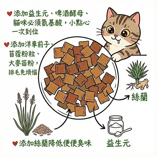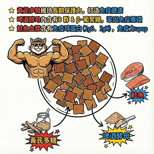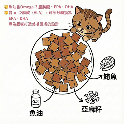 鮪魚粉、大米、玉米、小麥粉、甜菜粕、燐酸氫鈣、亞麻籽、茶多酚、甘露寡糖、起司粉、魚油