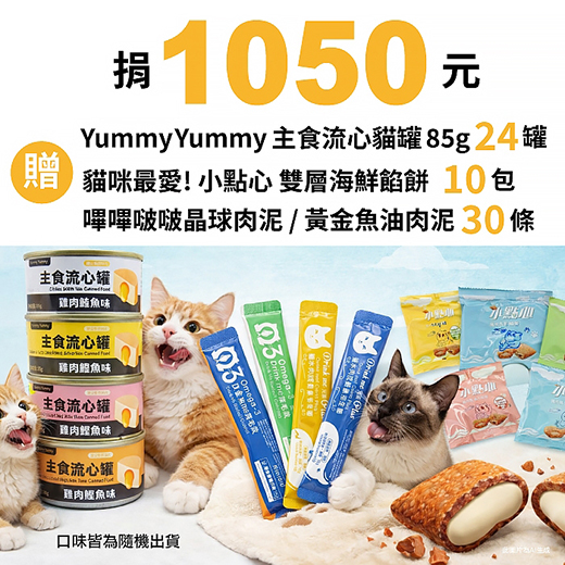候補人員: 說明: 捐1050元贈貓咪美味三重奏(口味皆隨機)流心主食貓罐85g*24罐+小點心雙層餡餅20g*10包+嗶嗶啵啵晶球肉泥/Omega-3魚油肉泥*30條