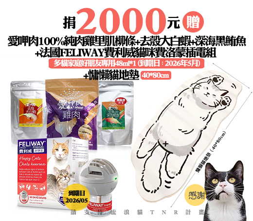 贈品名稱: 捐2000元贈愛呷肉100%純肉雞里肌柳條+去殼大白蝦+深海黑鮪魚+法國FELIWAY費利威貓咪費洛蒙插電組 (多貓家庭好朋友專用)(到期日:2026年5月)+慵懶貓地墊(40*80cm) 贈品總數: 16人 每人捐款金額: 2000元 已報名名額: 1 尚需求名額: 15 報名人員: 1.之之 (已付款)