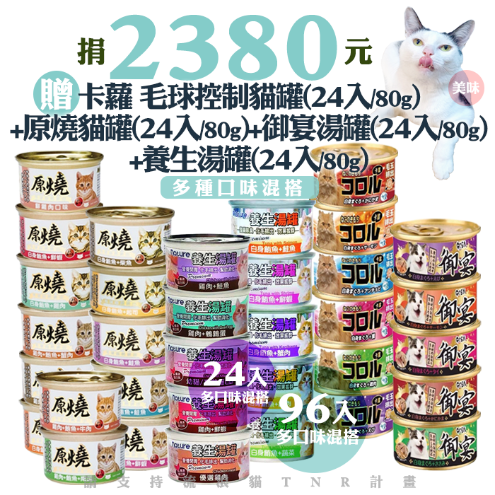 候補人員: 說明: 捐2380元贈卡蘿 毛球控制貓罐(24入/80g)+原燒貓罐(24入/80g)+御宴湯罐(24入/80g)+養生湯罐(24入/80g) (多種口味混搭)