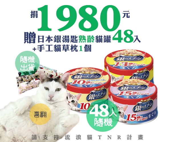 贈品名稱: 捐1980元 贈日本銀湯匙熟齡貓罐48入+手工貓草枕1個 贈品總數: 50人 每人捐款金額: 1980元 已報名名額: 0 尚需求名額: 50 報名人員: 候補人員: 說明: 捐1980元 贈日本銀湯匙熟齡貓罐48入+手工貓草枕1個