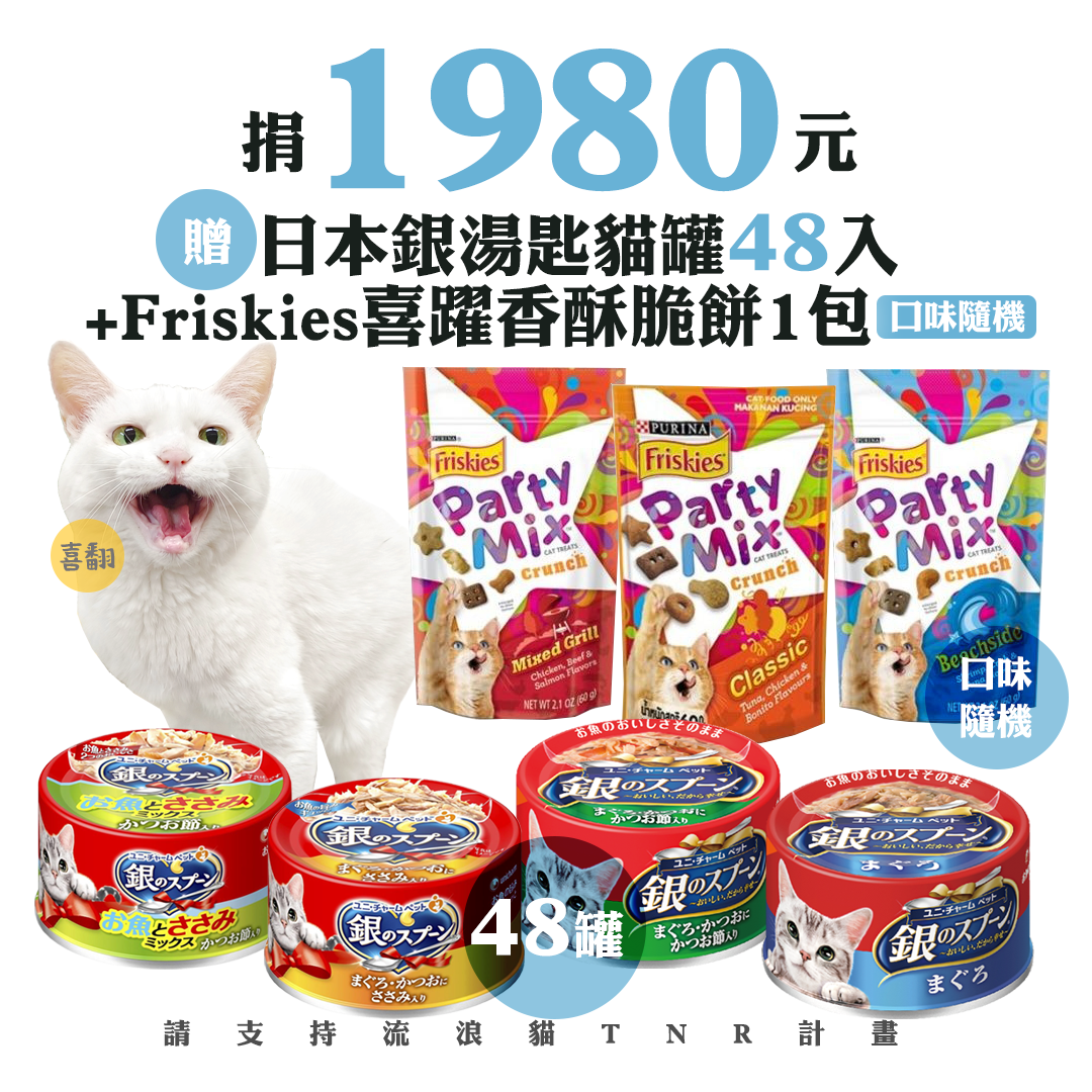 候補人員: 說明: 捐1980元贈日本銀湯匙貓罐48入+Friskies喜躍香酥脆餅1包(口味隨機)