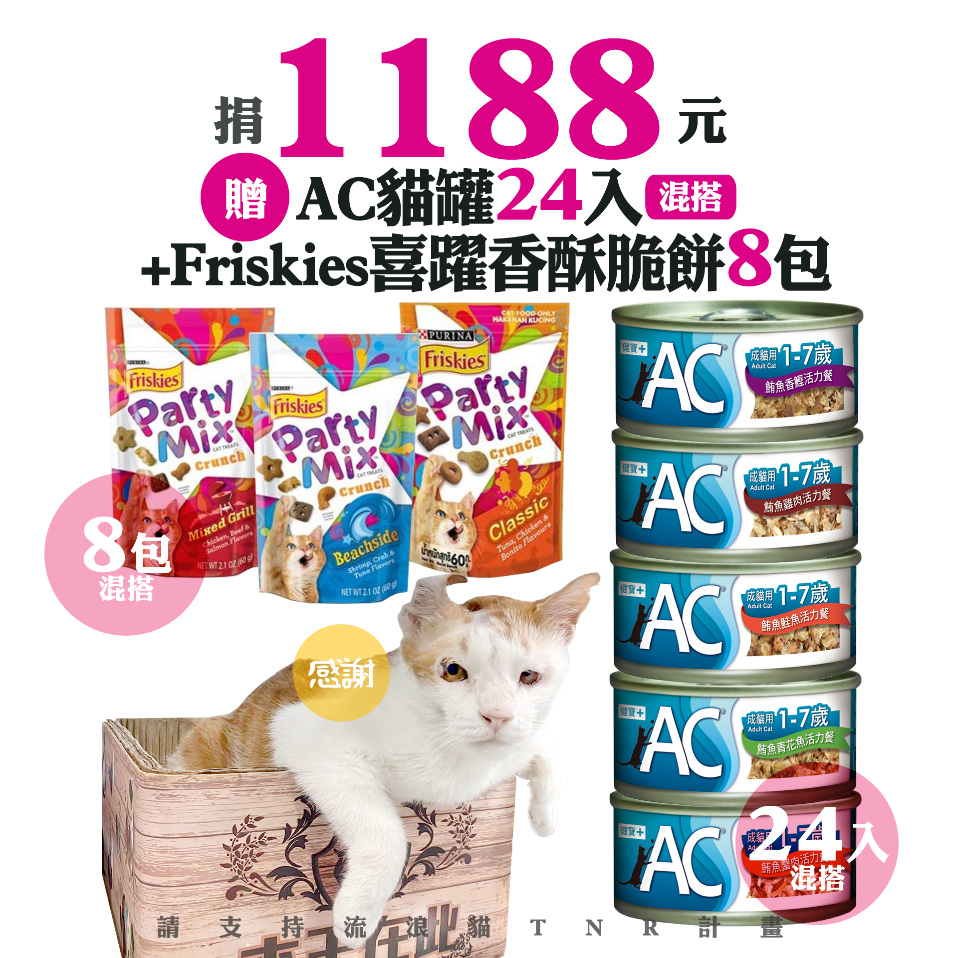 贈品名稱: 捐1188元贈AC貓罐24入(混搭)+Friskies喜躍香酥脆餅8包 贈品總數: 50人 每人捐款金額: 1188元 已報名名額: 0 尚需求名額: 50 報名人員: 候補人員: 說明: 捐1188元贈AC貓罐24入(混搭)+Friskies喜躍香酥脆餅8包