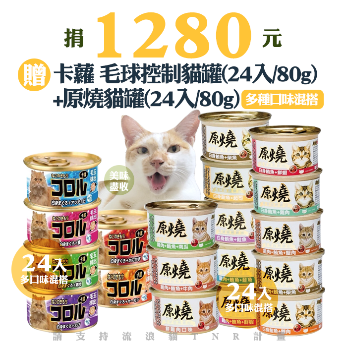 候補人員: 說明: 捐1280元贈卡蘿 毛球控制貓罐(24入/80g)+原燒貓罐(24入/80g)(多種口味混搭)