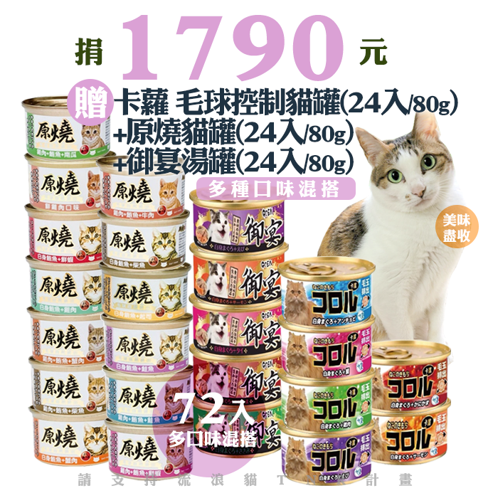 候補人員: 說明: 捐1790元贈卡蘿 毛球控制貓罐(24入/80g)+原燒貓罐(24入/80g)+御宴湯罐(24入/80g) (多種口味混搭)