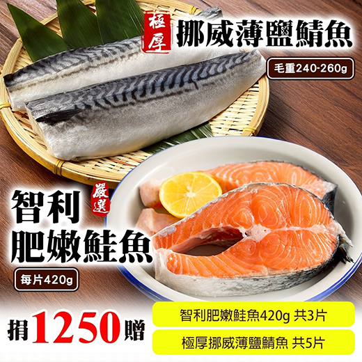 候補人員: 說明: 捐1250元贈智利肥嫩鮭魚420gx3片+極厚挪威薄鹽鯖魚240-260gx5片組