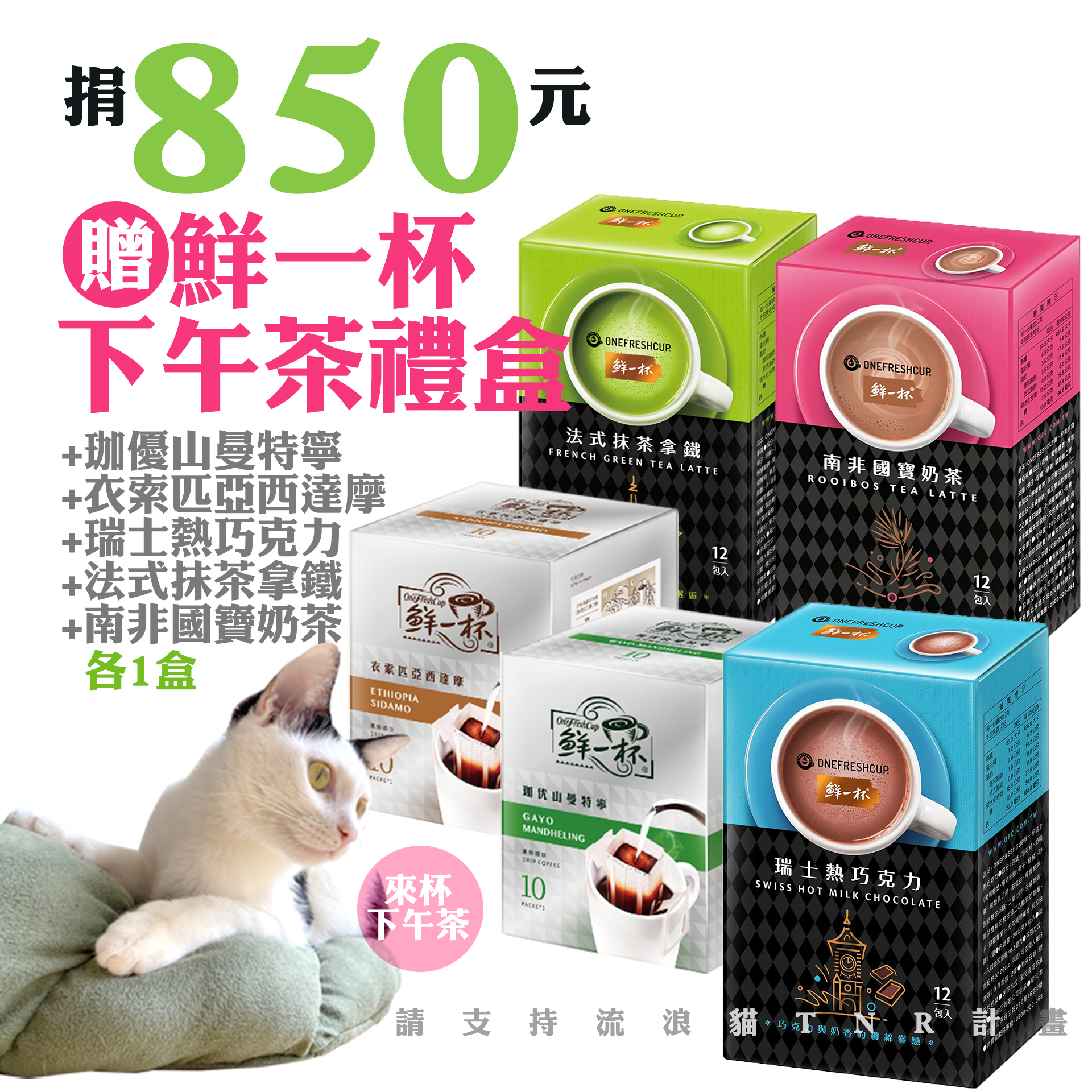 贈品名稱: 捐850元贈鮮一杯下午茶禮盒(珈優山曼特寧+衣索匹亞西達摩+瑞士熱巧克力+法式抹茶拿鐵+南非國寶奶茶各1盒) 贈品總數: 50人 每人捐款金額: 850元 已報名名額: 0 尚需求名額: 50 報名人員: 候補人員: 說明: 捐850元贈鮮一杯下午茶禮盒(珈優山曼特寧+衣索匹亞西達摩+瑞士熱巧克力+法式抹茶拿鐵+南非國寶奶茶各1盒)