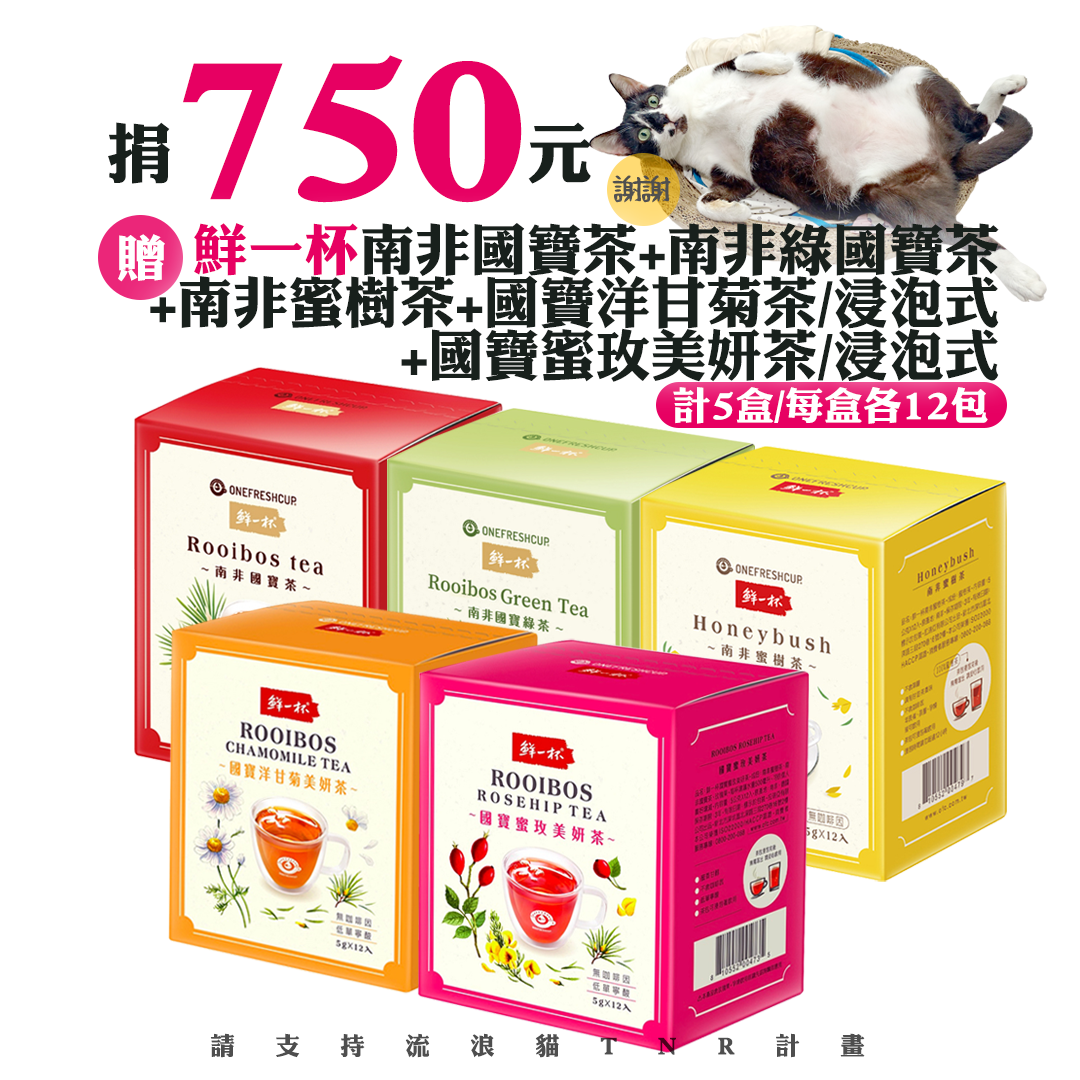 贈品名稱: 捐750元贈鮮一杯 南非國寶茶+南非綠國寶茶+南非蜜樹茶+國寶洋甘菊茶/浸泡式+國寶蜜玫美妍茶/浸泡式 (計5盒/每盒各12包) 贈品總數: 50人 每人捐款金額: 750元 已報名名額: 0 尚需求名額: 50 報名人員: 候補人員: 說明: 捐750元贈鮮一杯 南非國寶茶+南非綠國寶茶+南非蜜樹茶+國寶洋甘菊茶/浸泡式+國寶蜜玫美妍茶/浸泡式 (計5盒/每盒各12包)