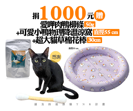 贈品名稱: 捐1000元贈愛呷肉鴨柳條50g+可愛小鴨物理降溫涼窩(直徑55 cm)+超大貓草棉花棒(30cm) 贈品總數: 25人 每人捐款金額: 1000元 已報名名額: 0 尚需求名額: 25 報名人員: 候補人員: 說明: 捐1000元贈愛呷肉鴨柳條50g+可愛小鴨物理降溫涼窩(直徑55 cm)+超大貓草棉花棒(30cm)