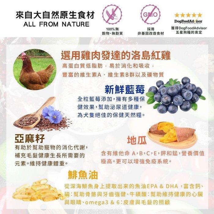 濃縮雞肉、地瓜、豌豆、濃縮魚肉、雞肉脂肪(與生育酚混合保存)、小扁豆、雞蛋、天然雞肝萃取物、馬鈴薯、蘋果、蔓越莓、菠菜、番茄、胡蘿蔔、魚油、蛋氨酸、氯化膽鹼、牛磺酸、維生素E、鹽、薑黃、幹乳桿菌、紫花苜蓿萃取物、硫酸鐵、硫酸鋅、硫酸亞鐵、菸酸補充劑、氧化錳、硫酸銅、硫胺素單硝酸鹽、泛酸鈣、維生素A、維生素B6、亞硒酸鈉、核黃素、維生素D3、生物素、維生素B12、碘酸鈣、葉酸。。