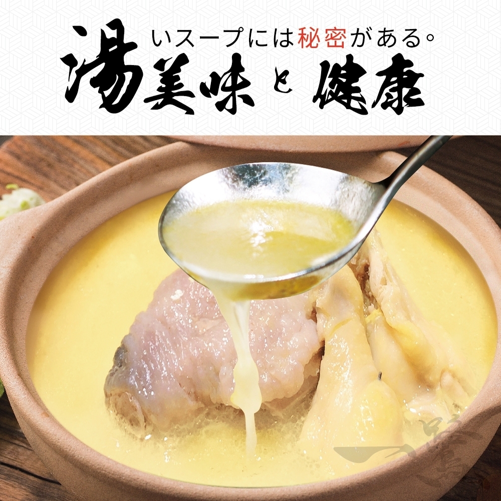 完成的湯濃郁甘甜,表層浮著一層有如黃金般的天然雞油。堅持一整鍋原湯從熬煮到完成時,成為濃縮至35%的濃郁湯頭故稱三割五分的黃金雞湯。