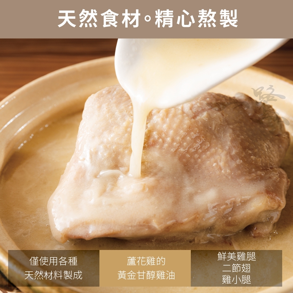 使用「日沐蘆花雞、粉紅雪鹽、水、等各式材料」並花費數小時以上來慢慢熬煮出的雞湯。要求整隻雞肉的甜味必須完整釋放。