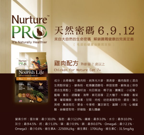 【商品成分】去骨雞肉,雞肉粉,純淨珍珠麥,蒸燕麥,雞肉油脂,鯡魚粉,酒釀乾燥酵母,乾燥甜菜果肉,鯡魚油,亞麻籽油,葵花籽油,椰子油,鷹嘴豆,蔓越莓,藍莓,蕃茄,蘿蔔,海藻,苜蓿,奇亞籽,牛磺酸,巴西利葉,葡萄糖胺,軟骨素,甘菊,肉桂,迷迭香萃取物,銀杏,蒲公英根,金盞花,薑黃,牛蒡根,薰衣草花,當歸根,L-賴氨酸,絲蘭,卵磷脂,氯化膽鹼。
