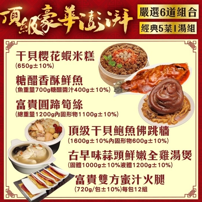 成分:大白菜、筍、干貝、鮑魚、栗子、魚翅、排骨酥(排骨、麵粉、地瓜粉、紅蔥碎、水、醬油(水、非基因改造黃豆(高蛋白豆片)、小麥、食鹽、酒精)、芋頭、豬腳(台灣)、魚皮、腳筋(台灣)、鴿蛋、香菇、魷魚、蝦米、沙拉油、烏醋(水、釀造酢、糖、鹽、洋蔥、濃縮柳橙汁(1.2%)、蕃茄糊、胡蘿蔔汁、大茴、小茴、芹菜籽、焦糖色素(第一類)、香料)、糖、鹽、白胡椒粉、調味劑(L-麩酸鈉)、太白粉