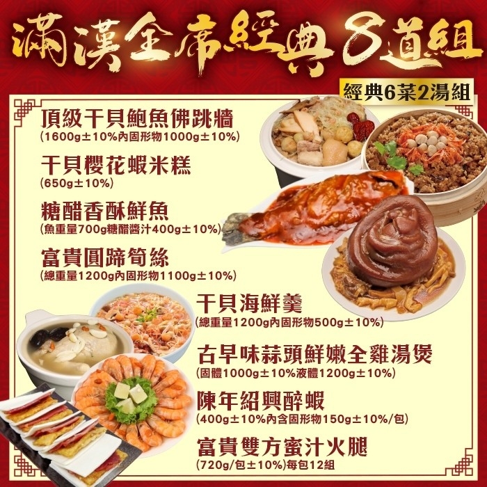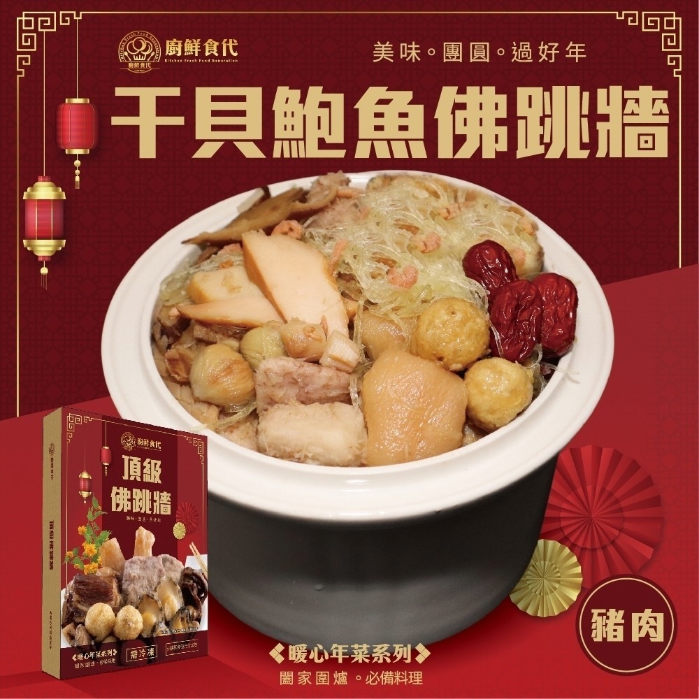成分:大白菜、筍、干貝、鮑魚、栗子、魚翅、排骨酥(排骨、麵粉、地瓜粉、紅蔥碎、水、醬油(水、非基因改造黃豆(高蛋白豆片)、小麥、食鹽、酒精)、芋頭、豬腳(台灣)、魚皮、腳筋(台灣)、鴿蛋、香菇、魷魚、蝦米、沙拉油、烏醋(水、釀造酢、糖、鹽、洋蔥、濃縮柳橙汁(1.2%)、蕃茄糊、胡蘿蔔汁、大茴、小茴、芹菜籽、焦糖色素(第一類)、香料)、糖、鹽、白胡椒粉、調味劑(L-麩酸鈉)、太白粉
