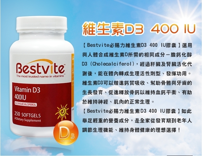 ●美國 BestVite 維他命D3膠囊 (400IU, 250錠)●