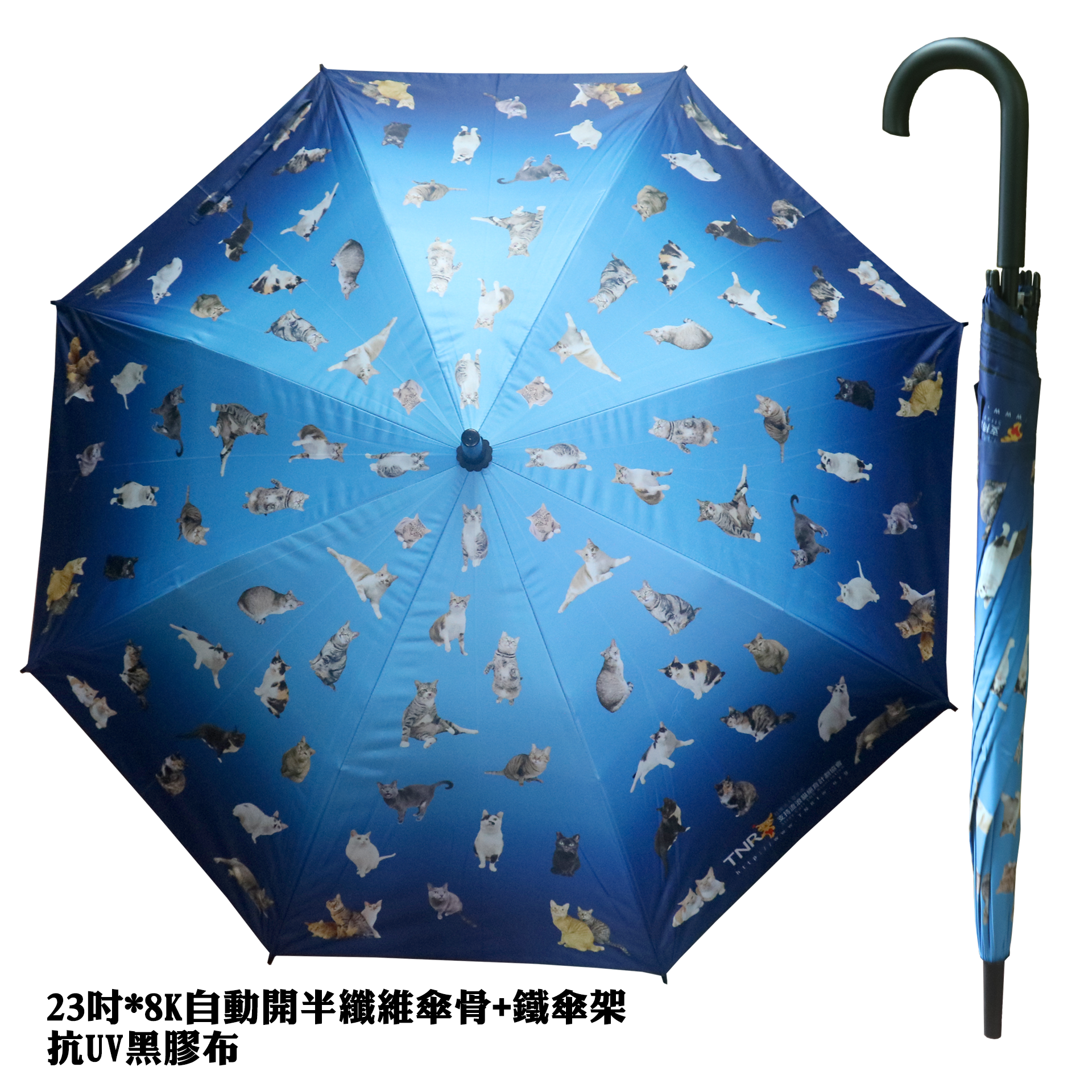 自動開半纖維傘骨+鐵傘架,抗UV黑膠布