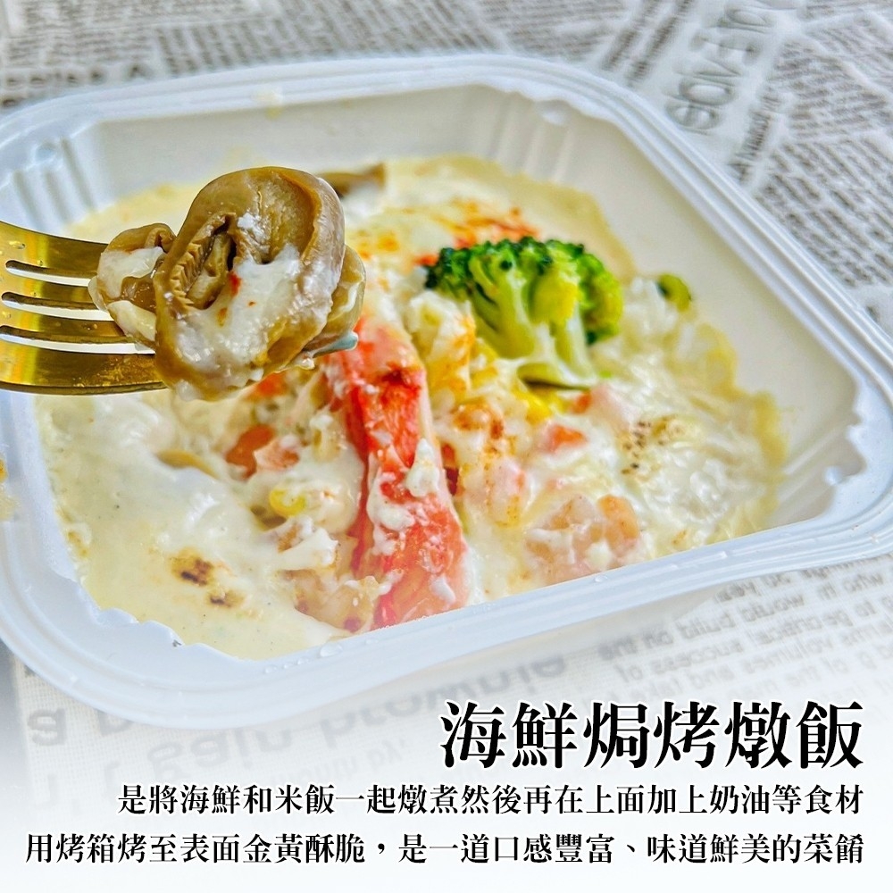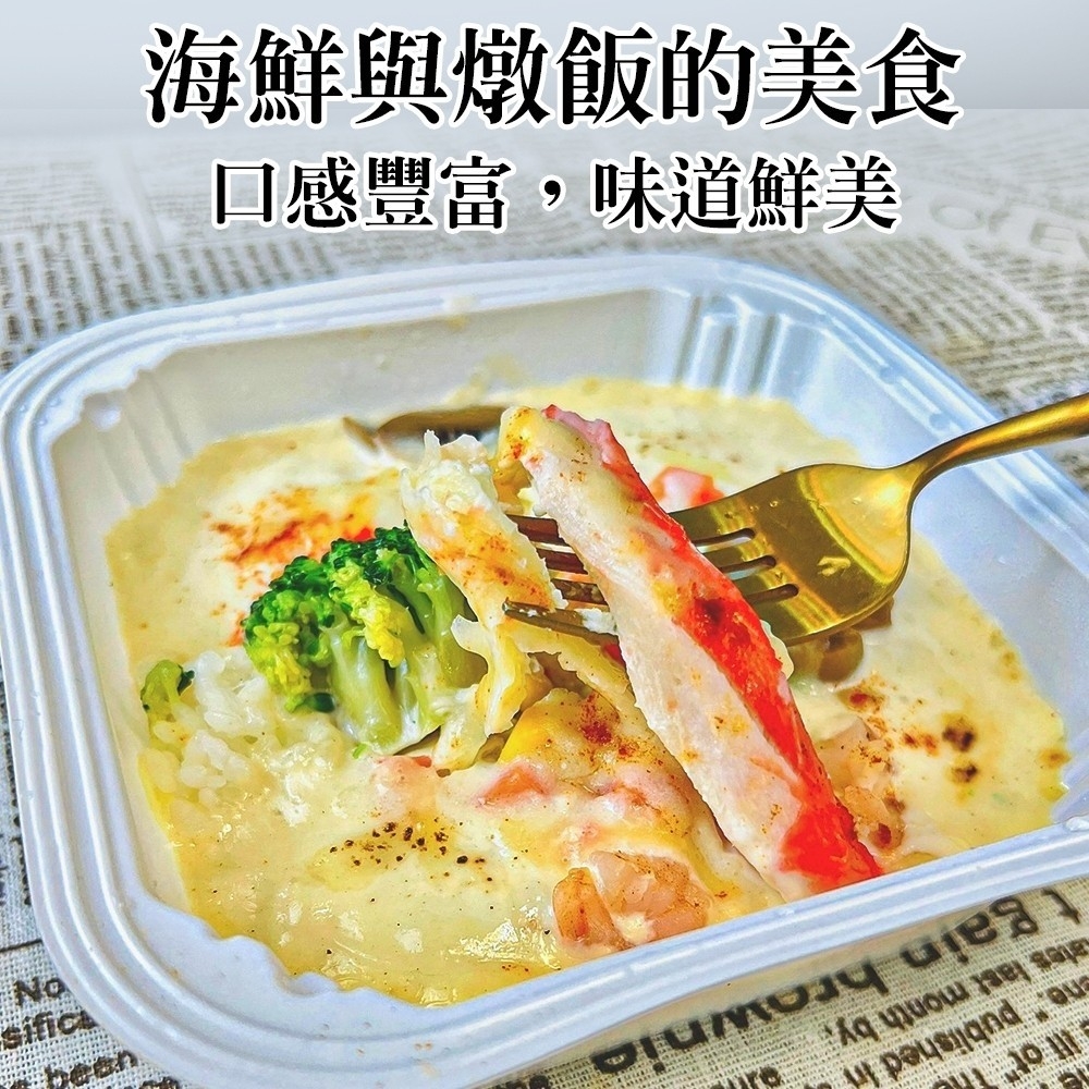 若想吃海鮮焗飯料理:可先微波加熱6~9分鐘,再倒出至耐熱焗烤容器內,自行鋪上乳酪絲後放入烤箱,烤至焦黃上色即可。