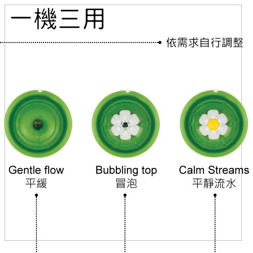 平緩、冒泡、平靜流水各三種,依需求及貓咪喜愛程度可自行作調整。