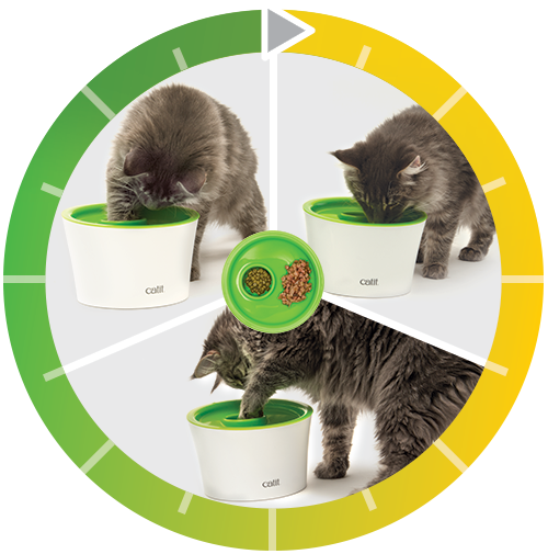 高度適當,可在最上層放置濕食、旁邊小圓狀凹處可用來隱藏食物,可以刺激貓咪的本能,用手取食、增加樂趣,好奇心使然,放慢貓咪吃飯的時間,防止貪食。