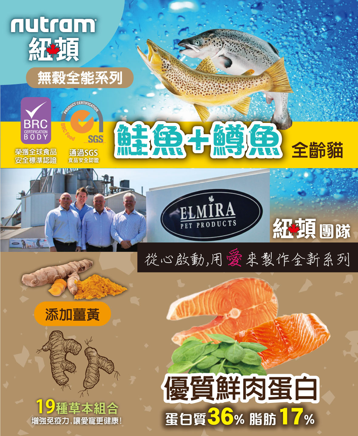 去骨鱒魚、鮭魚粉、鯡魚粉、豌豆、扁豆、鷹嘴豆、菜籽油、去骨鮭魚、鮭魚油、天然素食香料調味、胡蘿蔔、蘋果、冬南瓜、奎奴亞藜種子、氯化膽鹼、蔓越橘、藍莓、黑莓、羽衣甘藍、菊苣根(益生元)、維生素和礦物質、牛磺酸、絲蘭、菠菜、芹菜種子、薄荷、洋甘菊、薑黃、生薑、乾迷迭香