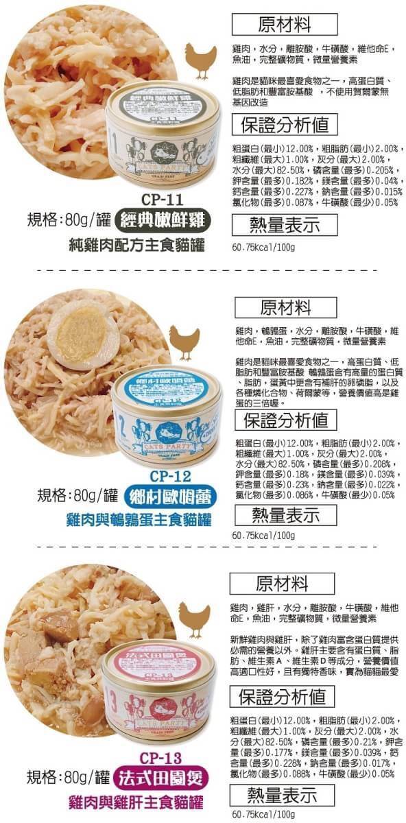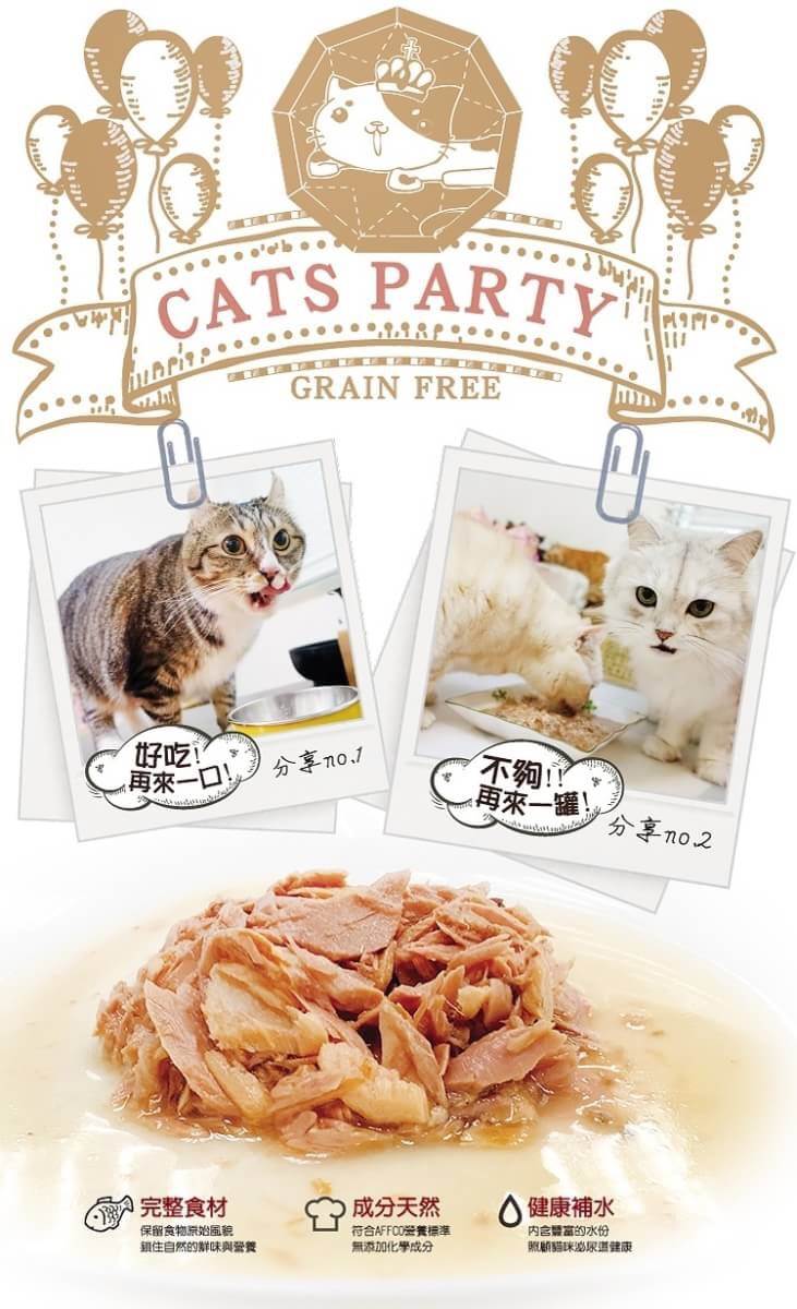Cats Party寵喵派對的罐頭 含水量比市售罐頭增加25%,同時補充肉類及魚類蛋白質