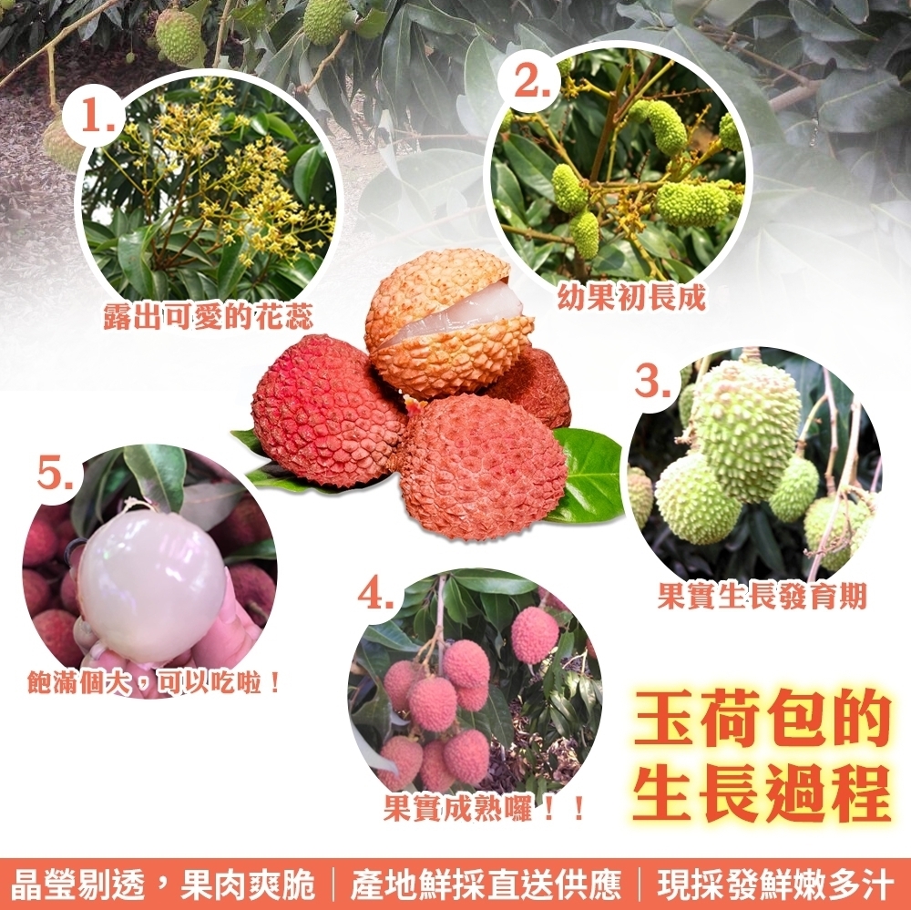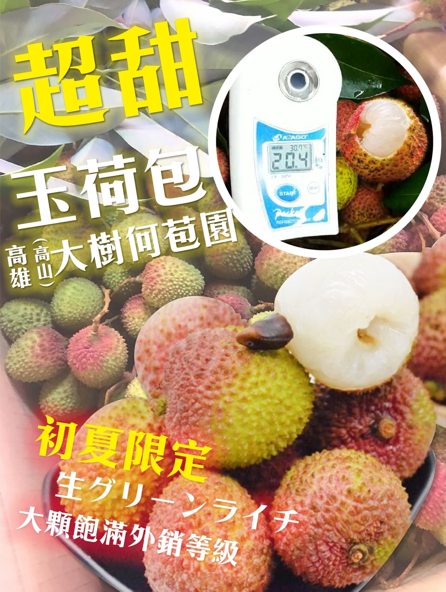 荔枝是夏天的聖品水果,玉荷苞品種最受歡迎,紅綠色外表、上圓下尖略呈心型、表面凸刺明顯,果核小且果肉豐厚、飽滿汁液,甜裡帶酸、Q軟有彈性,口感清新爽脆。冰涼後食用,更讓人清涼及酸香甜Q口感。