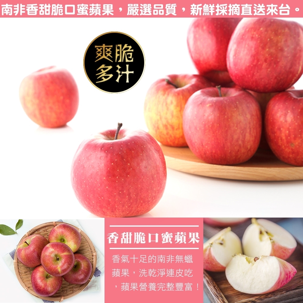 脆甜多汁!南非香甜脆口蜜蘋果,嚴選品質,新鮮採摘直送來台。一吃就能品嘗到那顆顆香甜美味,營養價值高!一天一蘋果,為健康更加分!幸福好滋味!
