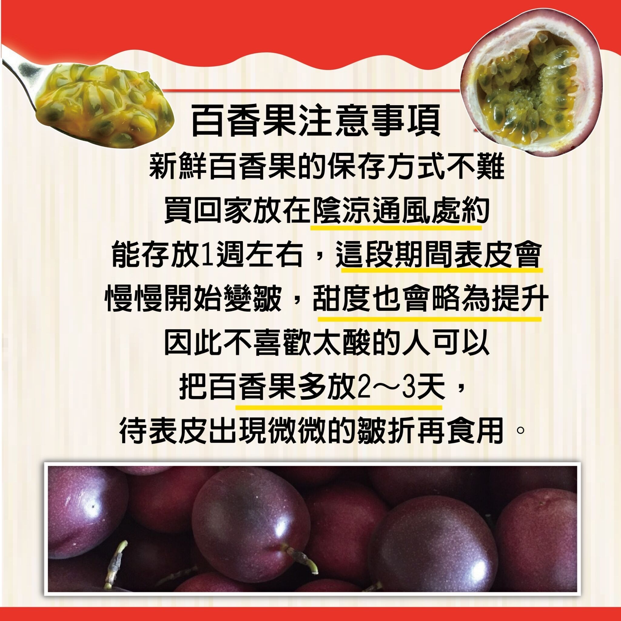 新鮮百香果的保存方式不難,買回家放在陰涼通風處約能存放1週左右,這段期間表皮會慢慢開始變皺,甜度也會略為提升,因此不喜歡太酸的人可以把百香果多放2∼3天,待表皮出現微微的皺折再食用。