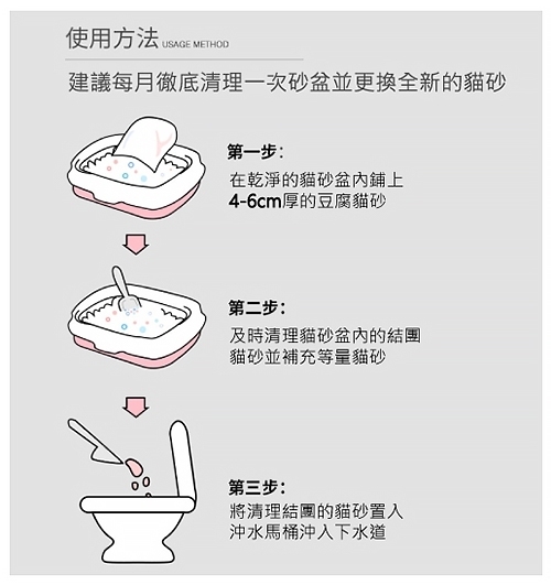 step3: 請經常性於貓砂減少時加入新鮮貓砂並保持5公分深度. 並固定每一個月清空貓砂並清洗一次便盆再倒入完全新的貓砂