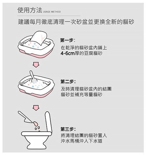 step3: 請經常性於貓砂減少時加入新鮮貓砂並保持5公分深度. 並固定每一個月清空貓砂並清洗一次便盆再倒入完全新的貓砂
