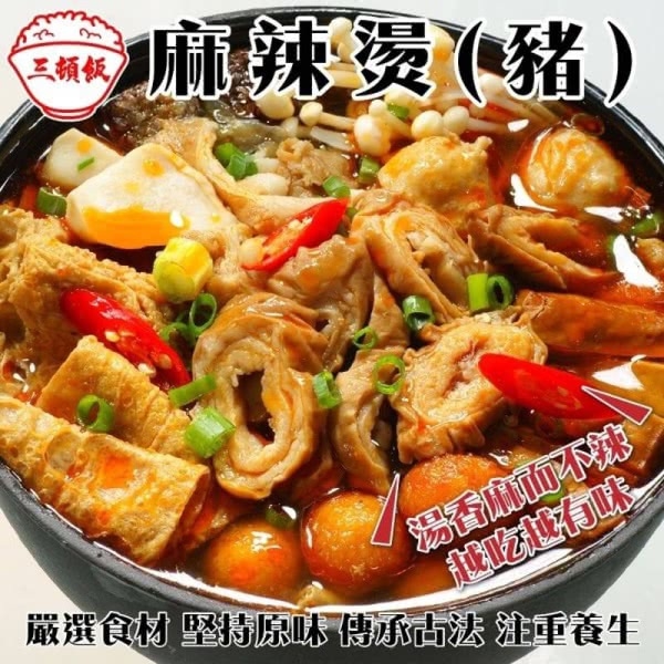 麻辣燙-豬 內容物:大白菜、水、豬大腸、鳥蛋、豬五花肉片、米血糕、小貢丸、豆干(非基因改造黃豆)、杏鮑菇金針菇、豆皮(基因改造黃豆)、小貢丸、麻辣醬(辣豆瓣醬(非基因改造黃豆)、黑豆瓣醬、酒釀、辣椒粉花椒粉、滷包、大骨粉、牛肉高湯、大豆油、醬油、砂糖、食鹽、白胡椒粉、麥芽糊精、雞肉粉、水解醬油粉、酵母抽出物、洋蔥粉、辣椒油、調味劑(L-麩酸鈉、琥珀酸二鈉、5'-鳥嘌呤核?磷酸二鈉、5'-次黃嘌呤核?磷酸二鈉、DL-胺基丙酸、胺基乙酸、檸檬酸鈉)