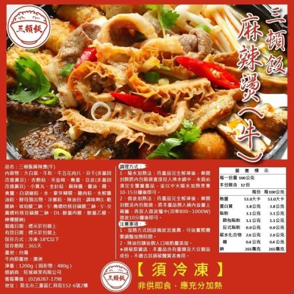 麻辣燙-牛 內容物:大白菜、牛肚、牛五花肉片、豆干(非基因改造黃豆)、杏鮑菇、米血糕、鳥蛋、豆皮(非基因改造黃豆)、小貢丸、金針菇、麻辣醬、醬油、糖、食鹽、白胡椒粉、水、麥芽糊精、雞肉粉、水解醬油粉、酵母抽出物、洋蔥粉、辣油包、調味劑(L-麩酸鈉、琥珀酸二鈉、5'-鳥嘌呤核?磷酸二鈉、5'-次黃嘌呤核?磷酸二鈉、DL-胺基丙酸、胺基乙酸、檸檬酸鈉)