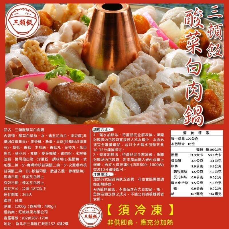 酸菜白肉鍋成份: 酸白菜絲、水、豬五花肉片、凍豆腐(基因改造黃豆)、排骨酥、鳥蛋、豆皮(基因改造黃豆)、草菇、香菇、木耳絲、香菇丸、花枝丸、虱目魚丸、椿花片、食鹽、麥芽糊精、雞肉粉、水解醬油粉、酵母抽出物、洋蔥粉、調味劑(L-麩酸鈉、琥珀酸二鈉、5'-鳥嘌呤核苷磷酸二鈉、5'-次黃嘌呤核苷磷酸二鈉、DL-胺基丙酸、胺基乙酸、檸檬酸鈉)