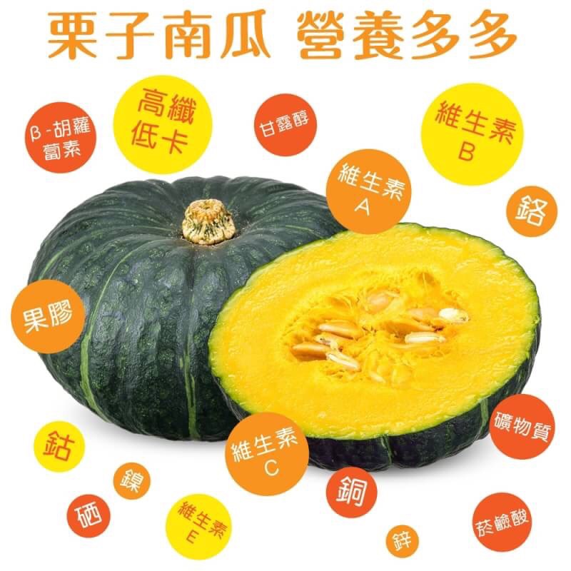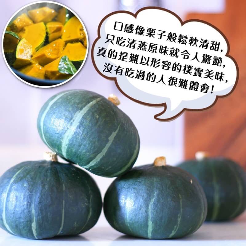 特選純日本品種,綠皮栗子南瓜口感比較鬆,適合清蒸、熱炒、燉湯;紅皮栗子南瓜口感比較濕潤綿密,適合煮南瓜濃湯、打南瓜牛奶,清蒸也沒問題。